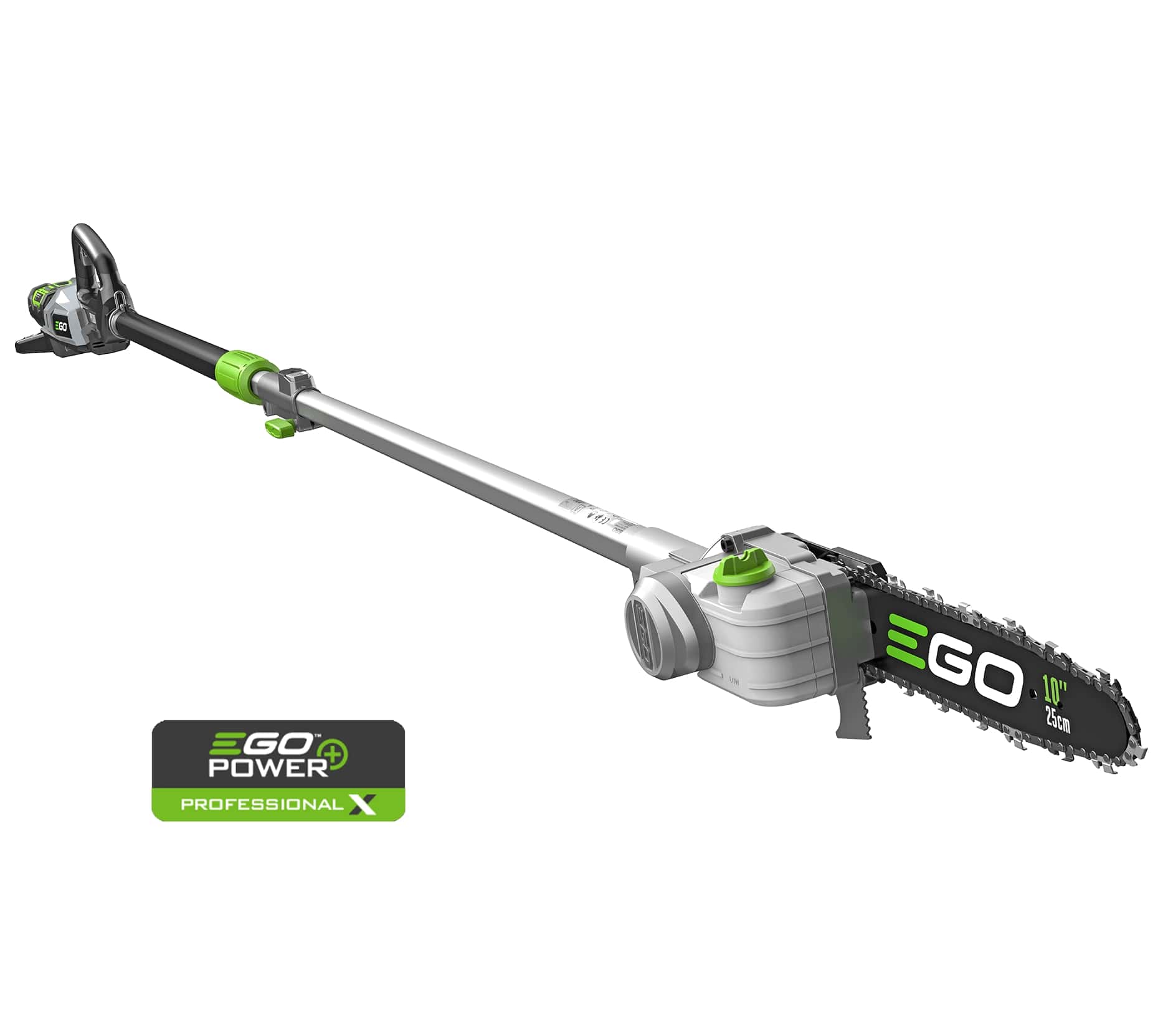 Commentaar: EGO telescopische snoeizaag opzetdeel PSX2500 t.b.v Professional X telescopische steel PPX1000 (afzonderlijk te bestellen). EGO’s telescopisch snoeisysteem voor de professionele gebruiker biedt de mogelijkheid om takken af te zagen op grote hoogtes, zonder gebruik te hoeven maken van een ladder. Dit snoeizaag opzetdeel is voorzien van een borstelloze motor die optimaal vermogen en zaagsnelheid biedt om takken met een diameter van 200 mm met gemak af te zagen. Deze telescopische snoeizaag kan ingesteld worden met een draaihoek van 0-180º en heeft een extra rotatiemogelijkheid. Ook is deze snoeizaag uitgerust met een stevige haak om eenvoudig loszittende takken uit de boom te trekken. De uitblaas aan de bovenkant van de motor zorgt deze niet snel vast komt te zitten zodat je ongestoord door kunt werken. De totale lengte van deze snoeischaar is 140 cm. Wanneer deze volledig is uitgeschoven heeft de stoksnoeizaag een lengte van 4 meter.
